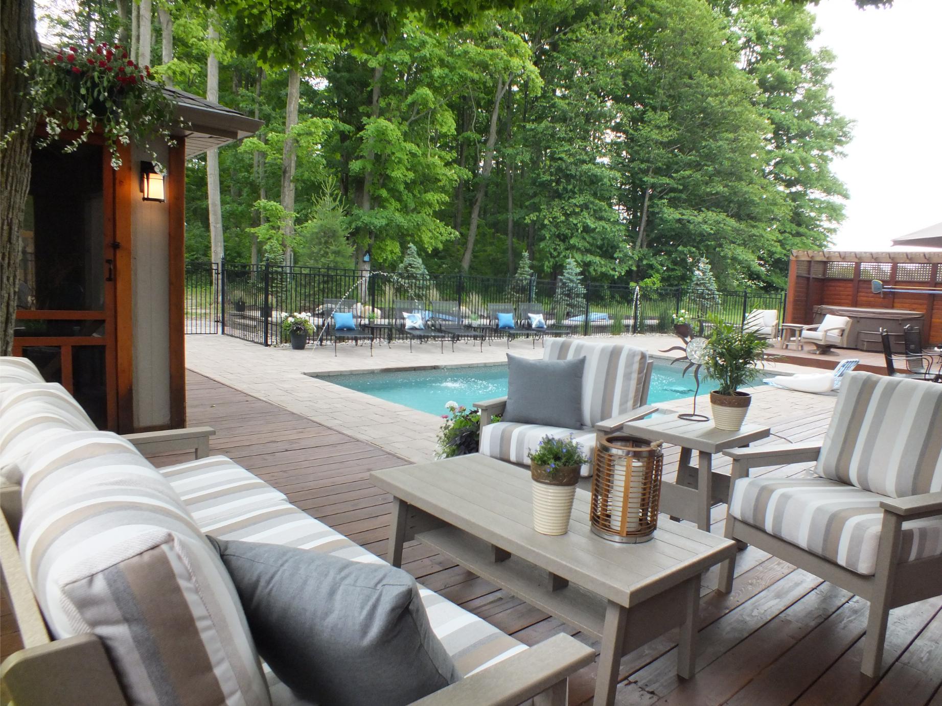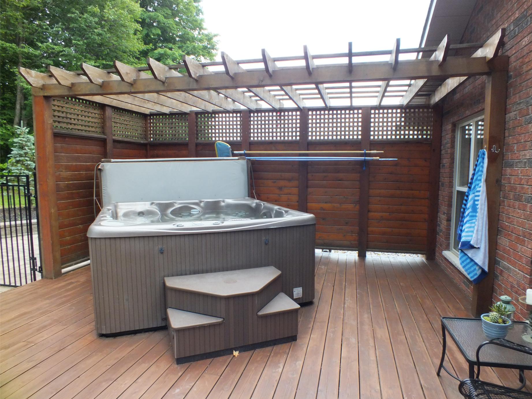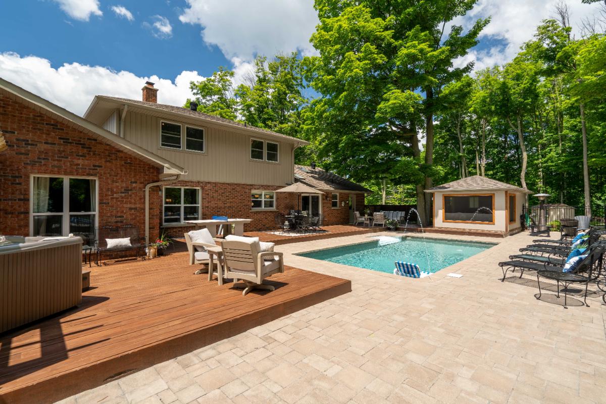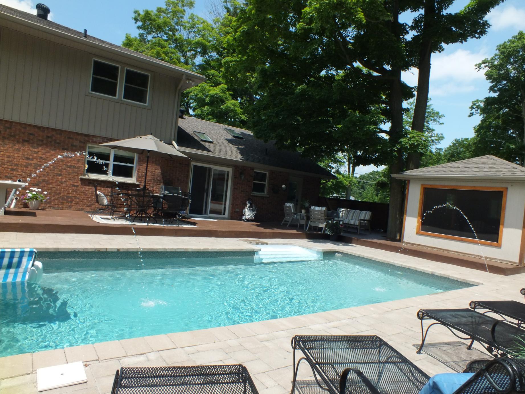 New Landscaping wrapping around both sides of the house leads to a family size deck, new pool, screened cabana and hot tub.