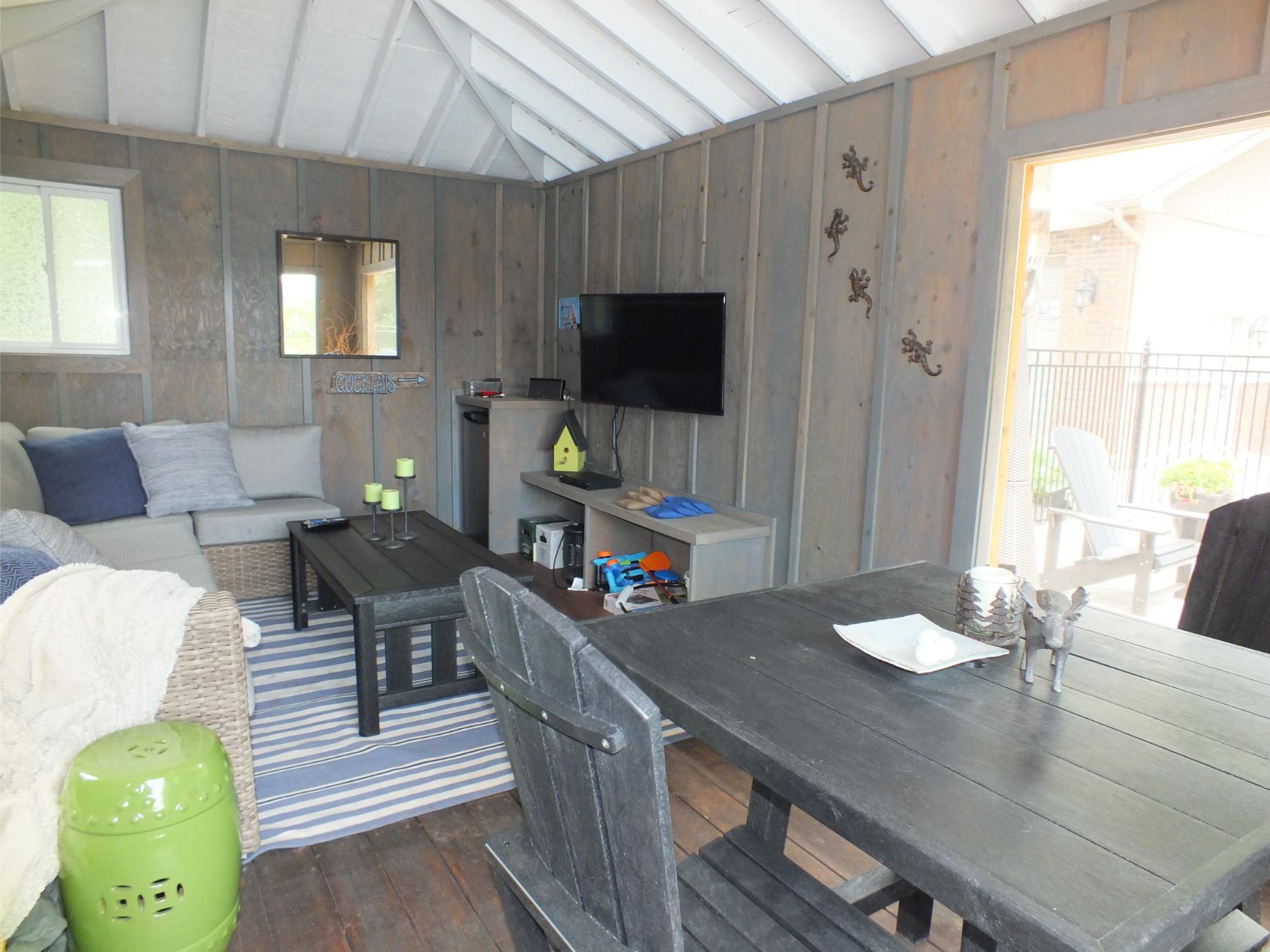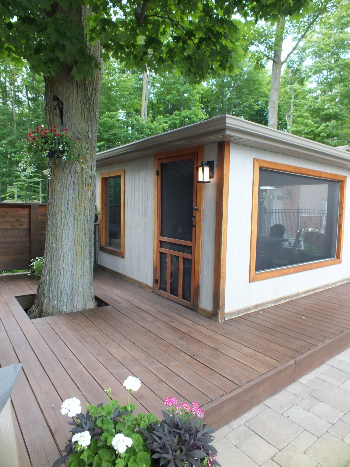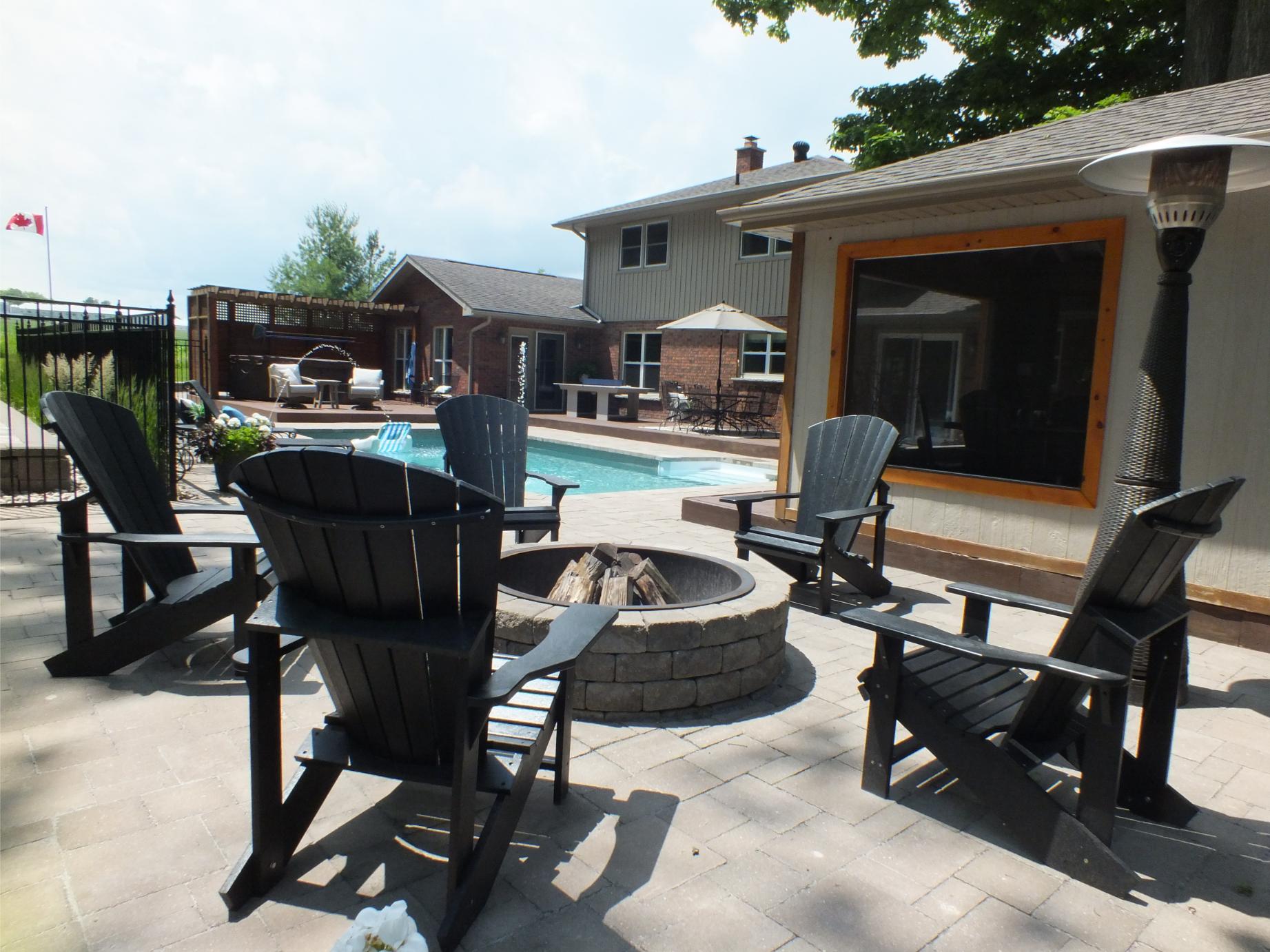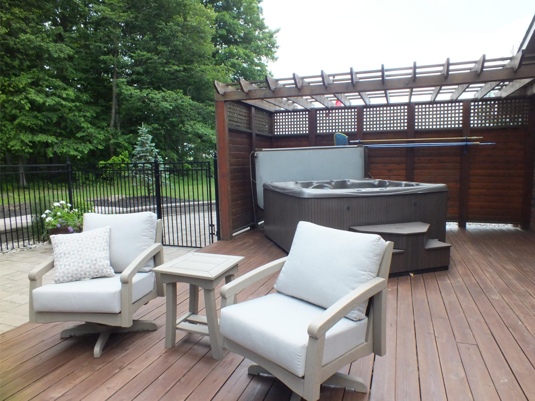 New Landscaping wrapping around both sides of the house leads to a family size deck, new pool, screened cabana and hot tub.